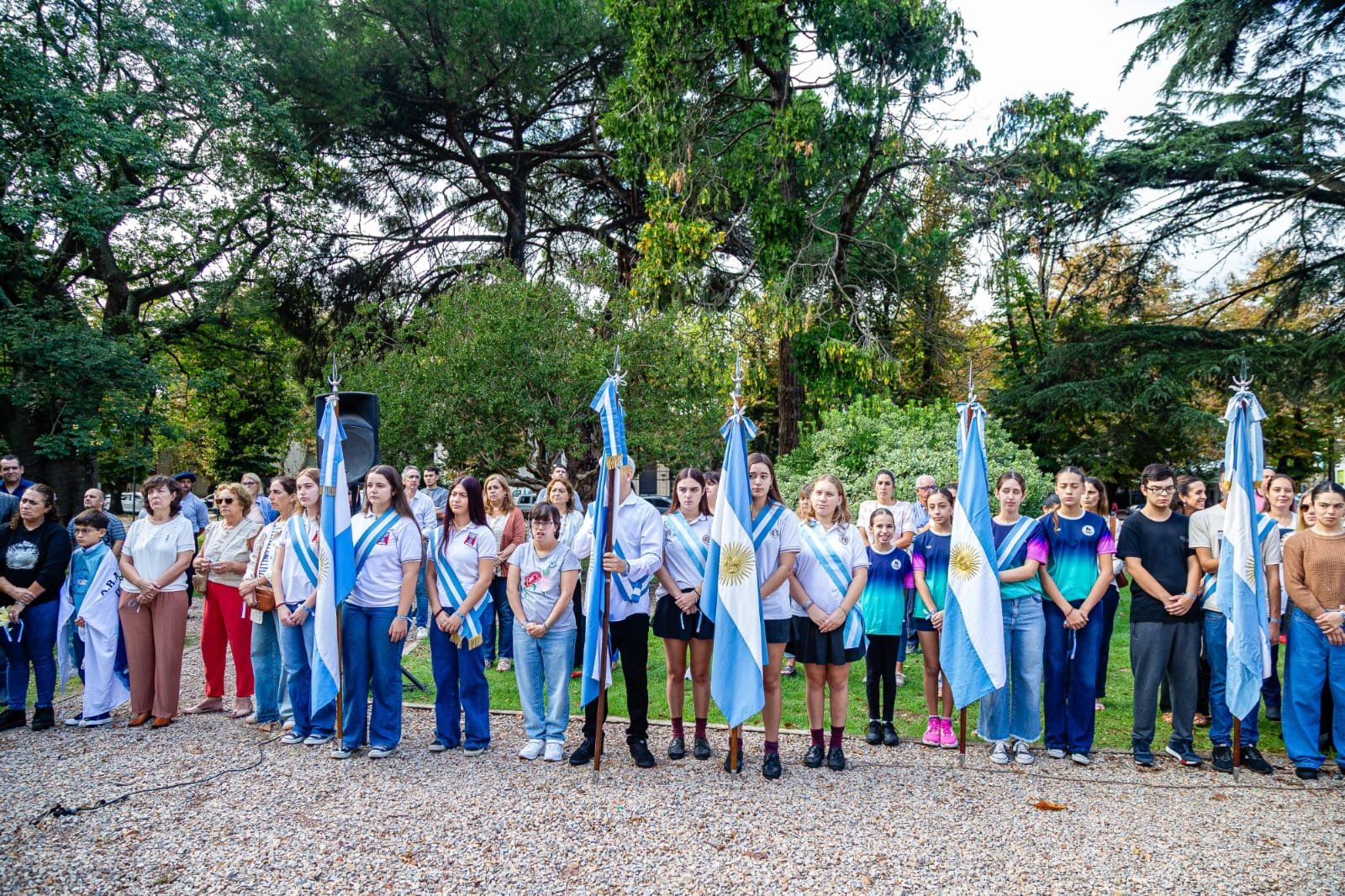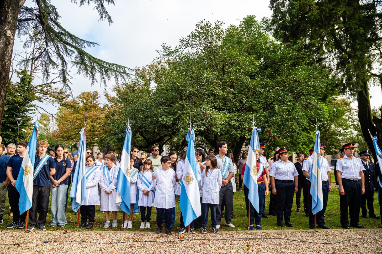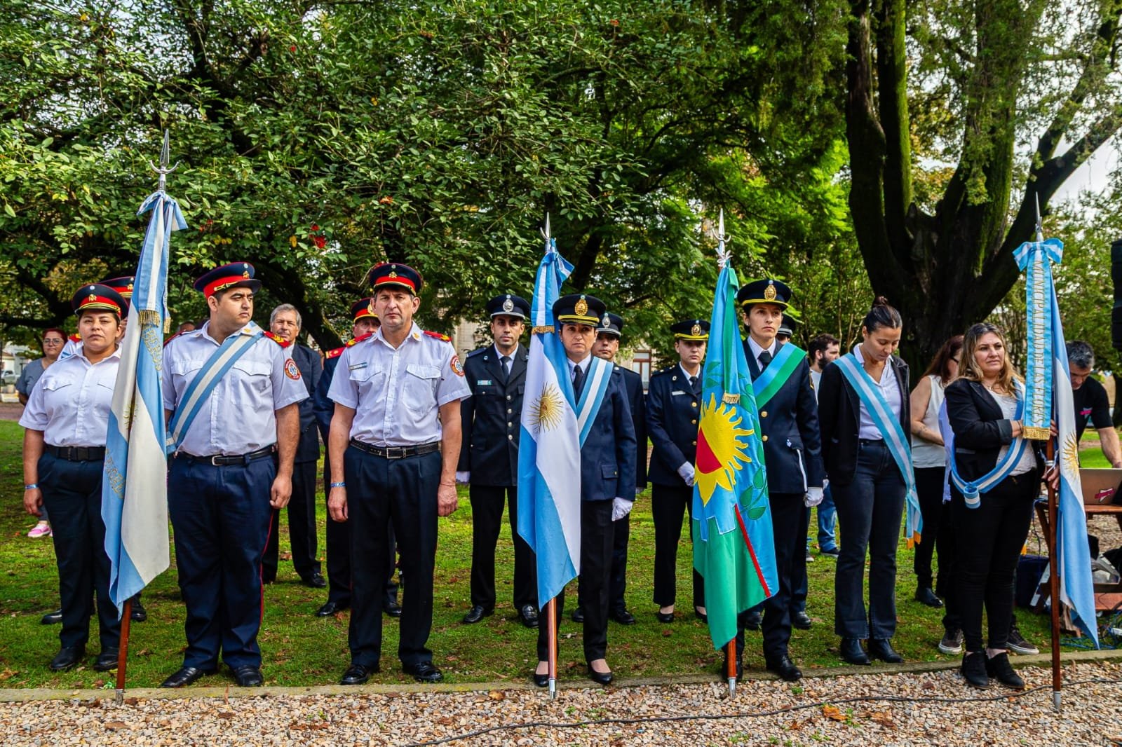 Estuvieron presentes también alumnos, directivos y abanderados de distintos establecimientos escolares, representantes de las fuerzas policiales, Bomberos Voluntarios y referentes de instituciones intermedias. Tras la entonación del Himno Nacional Argentino, el cura párroco Eduardo Campión realizó una invocación religiosa, seguida por las palabras de la Secretaria de Educación y Cultura, Silveria Giménez, quien brindó un mensaje de absoluto reconocimiento a los héroes de una guerra que marcó a generaciones enteras.