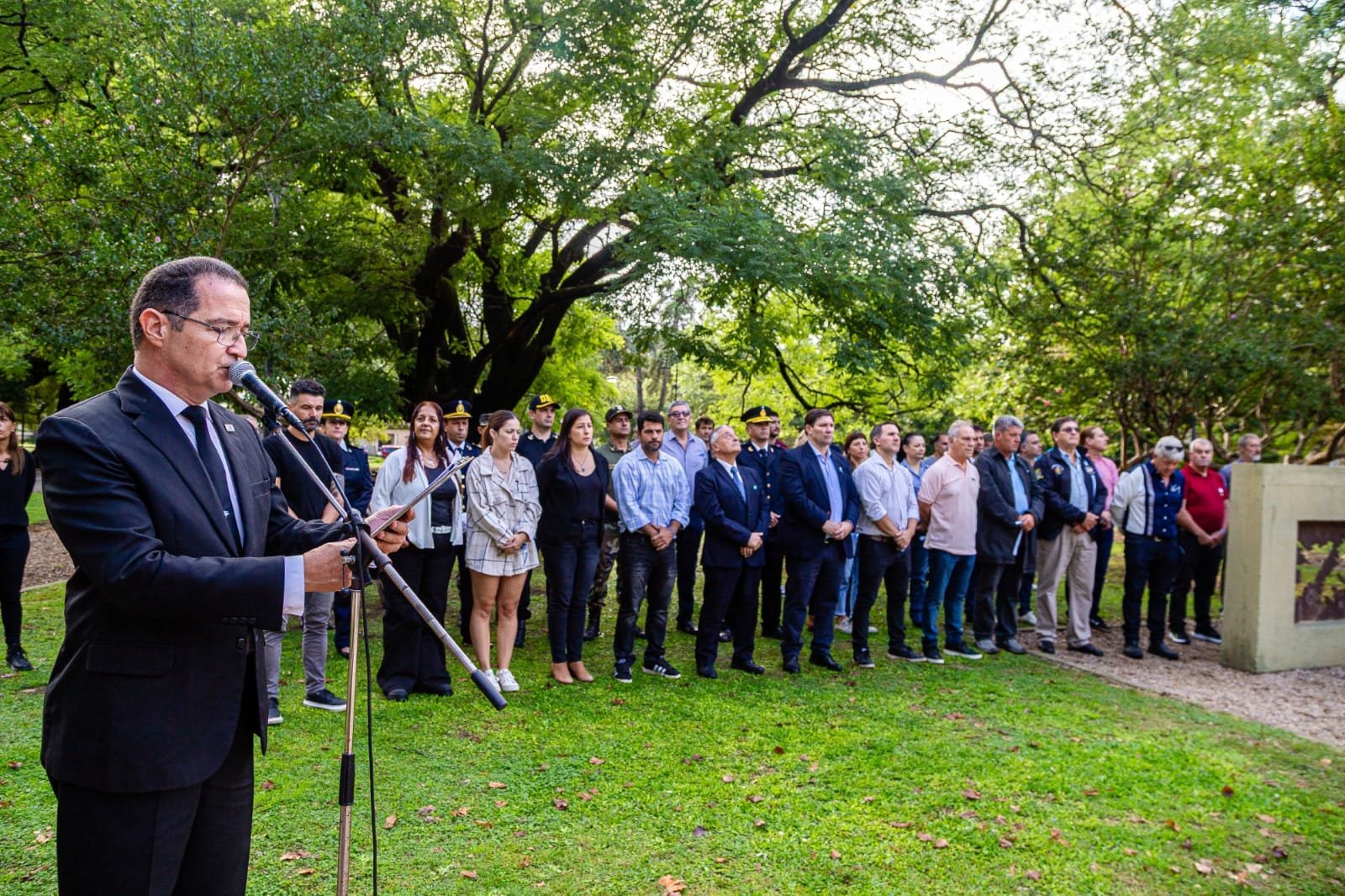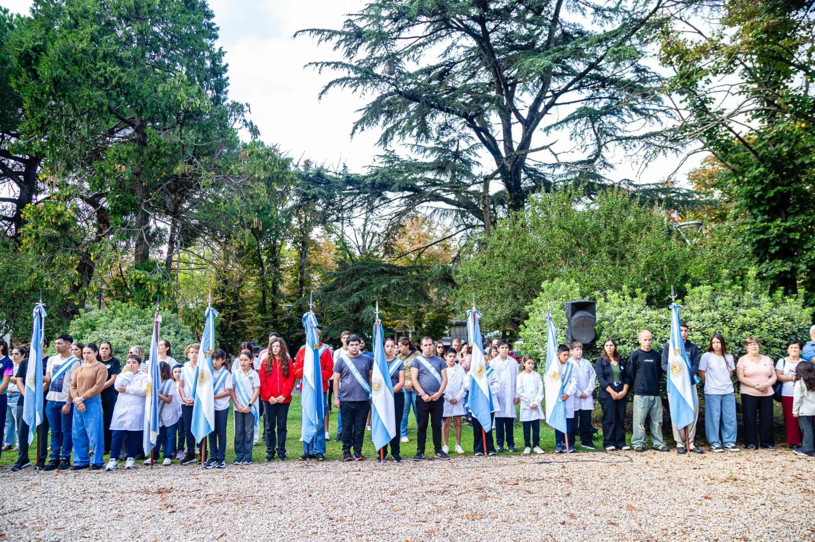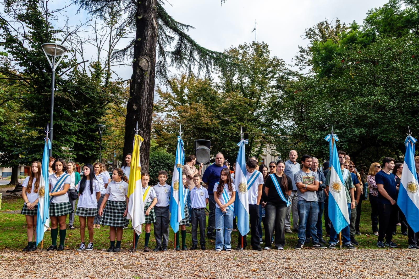Estuvieron presentes también alumnos, directivos y abanderados de distintos establecimientos escolares, representantes de las fuerzas policiales, Bomberos Voluntarios y referentes de instituciones intermedias. Tras la entonación del Himno Nacional Argentino, el cura párroco Eduardo Campión realizó una invocación religiosa, seguida por las palabras de la Secretaria de Educación y Cultura, Silveria Giménez, quien brindó un mensaje de absoluto reconocimiento a los héroes de una guerra que marcó a generaciones enteras.