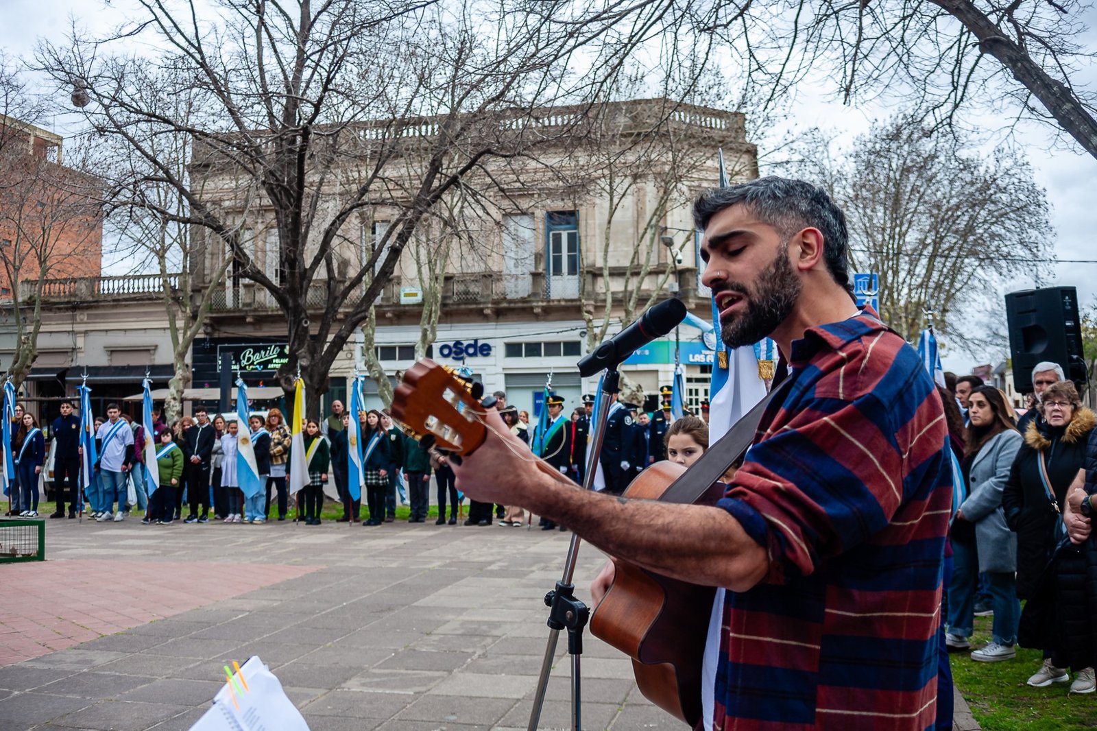 En el inicio, el intendente Alberto Gelené; el presidente del Concejo Deliberante, Fabián Blanstein; e integrantes de la Agrupación Sanmartiniana de Las Flores, fueron los encargados del arrío a media asta de la Bandera Argentina en el mástil central del espacio público. Seguidamente se hizo el Toque de Silencio y se entonó el Himno Nacional.
