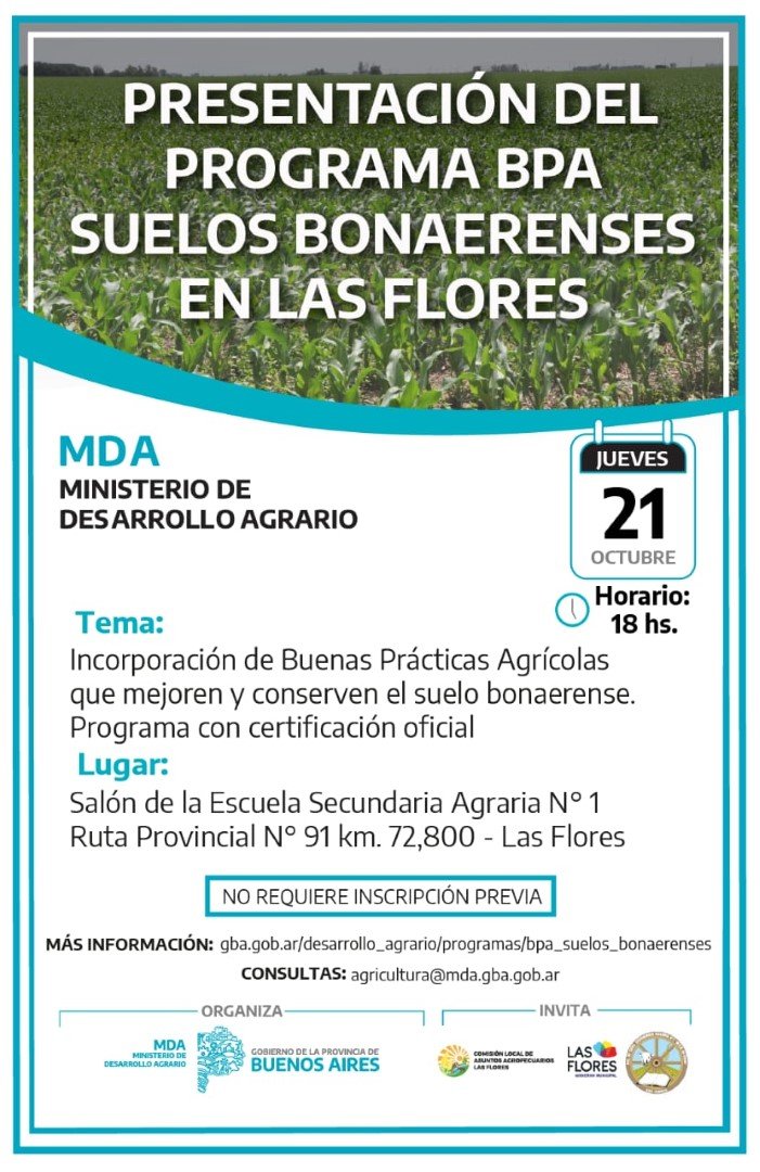 A las 18 hs se desarrollará el encuentro sobre el programa de Buenas Prácticas Agrícolas-Suelos Bonaerenses, que establece una serie de requisitos y recomendaciones que habilitan el registro de los productores y las productoras BPA, como así también un incentivo económico dependiendo del nivel de cumplimiento de las pautas y la superficie de tierra que se trabaja en el marco de estas buenas prácticas.