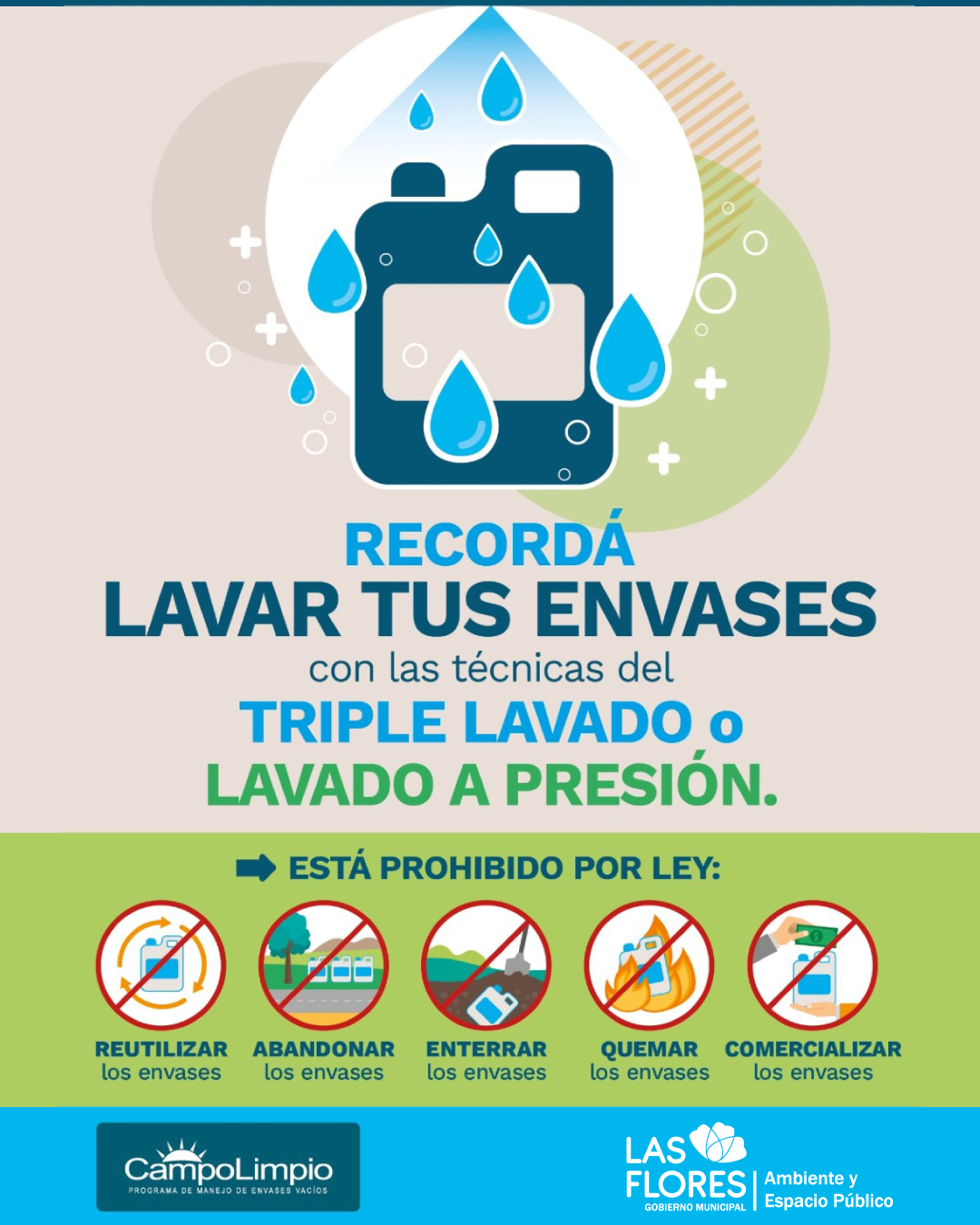 Los envases de fitosanitarios deben entregarse vacíos y lavados con las técnicas de triple lavado o lavado a presión (norma IRAM 12.069). Todo envase que no cuente con este tratamiento no podrá ser recepcionado.