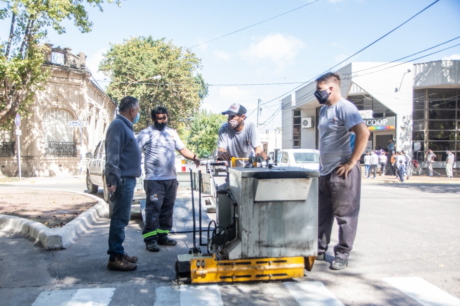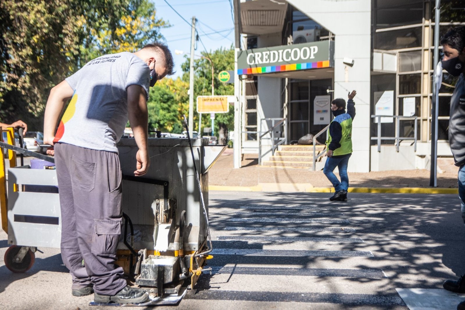 La Dirección de Comunicación Visual comenzó esta semana con el demarcado de sendas peatonales, en esta ocasión en la intersección de Av. San Martín y 9 de Julio.