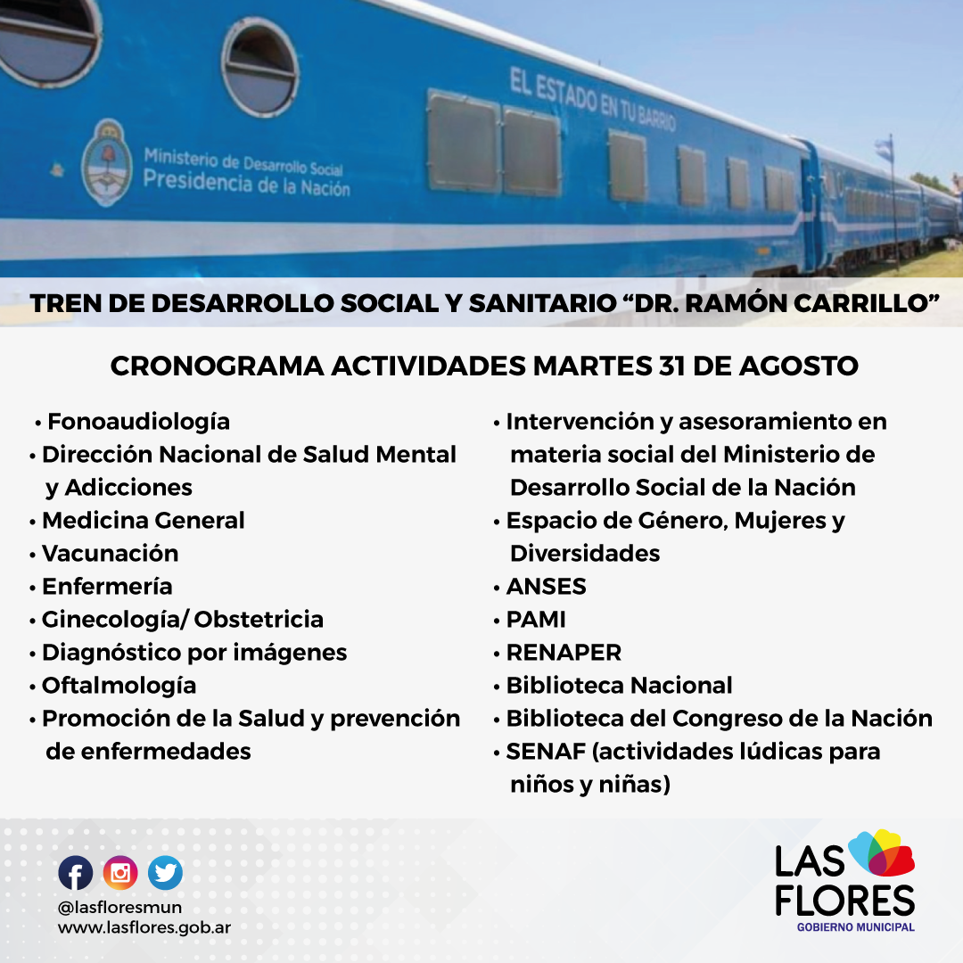 Cabe aclarar que el RENAPER (Registro Nacional de las Personas) continúan con el operativo realizado la semana pasada en el Salón Rojo Municipal con tramites de DNI, Pasaporte, Certificado de Pre-identificación, en el tren “Dr. Ramón Carrillo”.