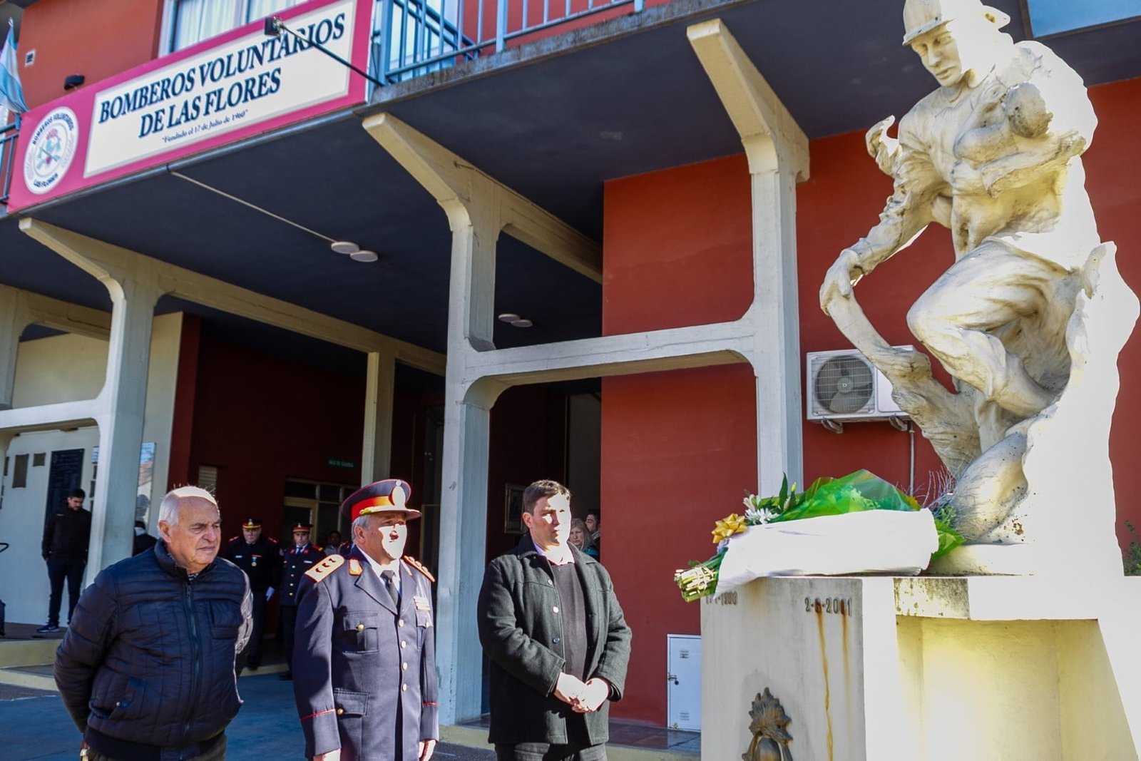 Durante el acto, el intendente interino fue invitado, junto al presidente de la entidad Cte. Mayor Carlos Pila, al izamiento de la Enseña Nacional y también junto al fundador Angel Cejas, a la colocación de una ofrenda floral en el monumento al Bombero ubicado junto al mástil.
