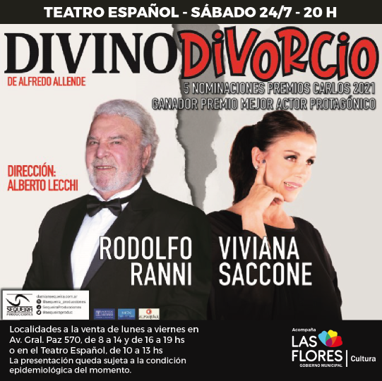 El sábado 24, a las 20 h, en el Teatro Español se pondrá en escena la obra teatral “Divino Divorcio”. En esta ocasión, arribarán a nuestra ciudad con esta comedia desopilante, Viviana Saccone y Rodolfo Ranni, dos actores de destacada trayectoria en el cine, el teatro y la televisión de nuestro país.