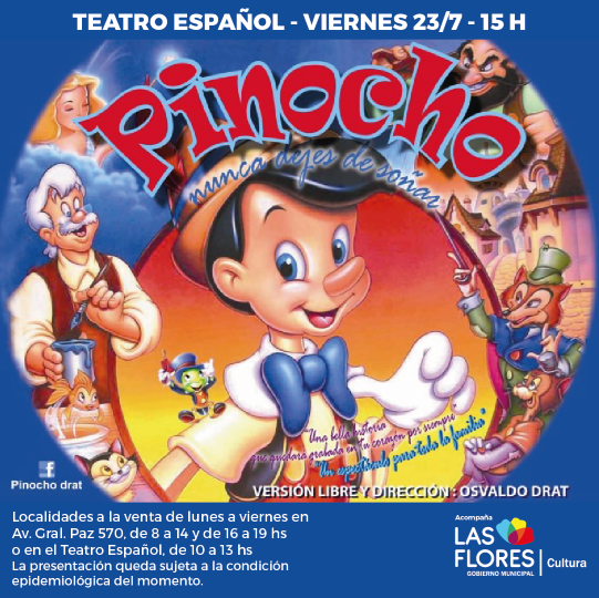 El viernes 23 de Julio, a las 15 hs, el Teatro Español reabre sus puertas al público con la presentación de la obra infantil Pinocho “Nunca dejes de soñar”.