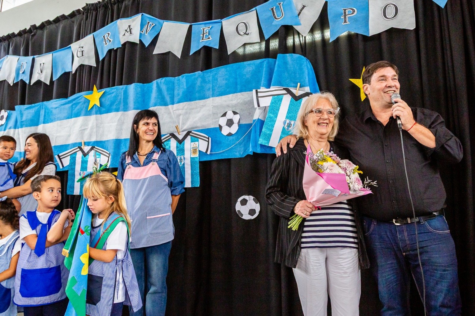 En un momento especialmente conmovedor, el intendente invitó a la docente Alicia De Bellis, quien fuera su maestra de jardín hace más de cuarenta años, para saludarla y que también sea protagonista de este nuevo comienzo del ciclo lectivo.