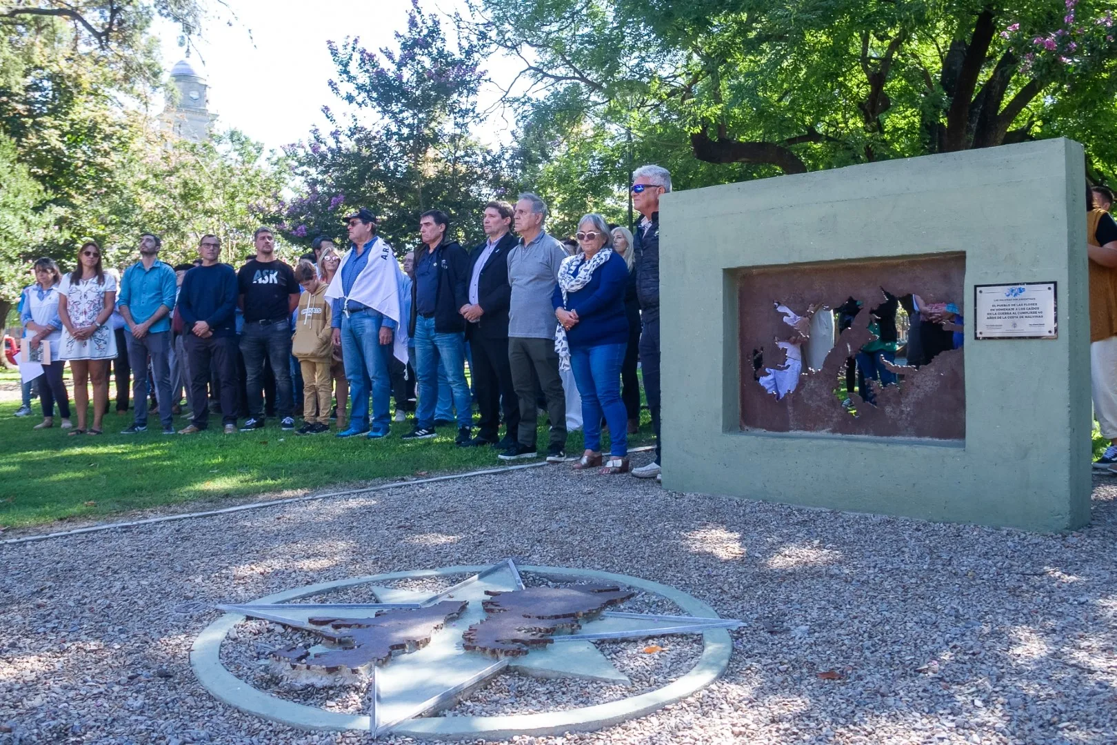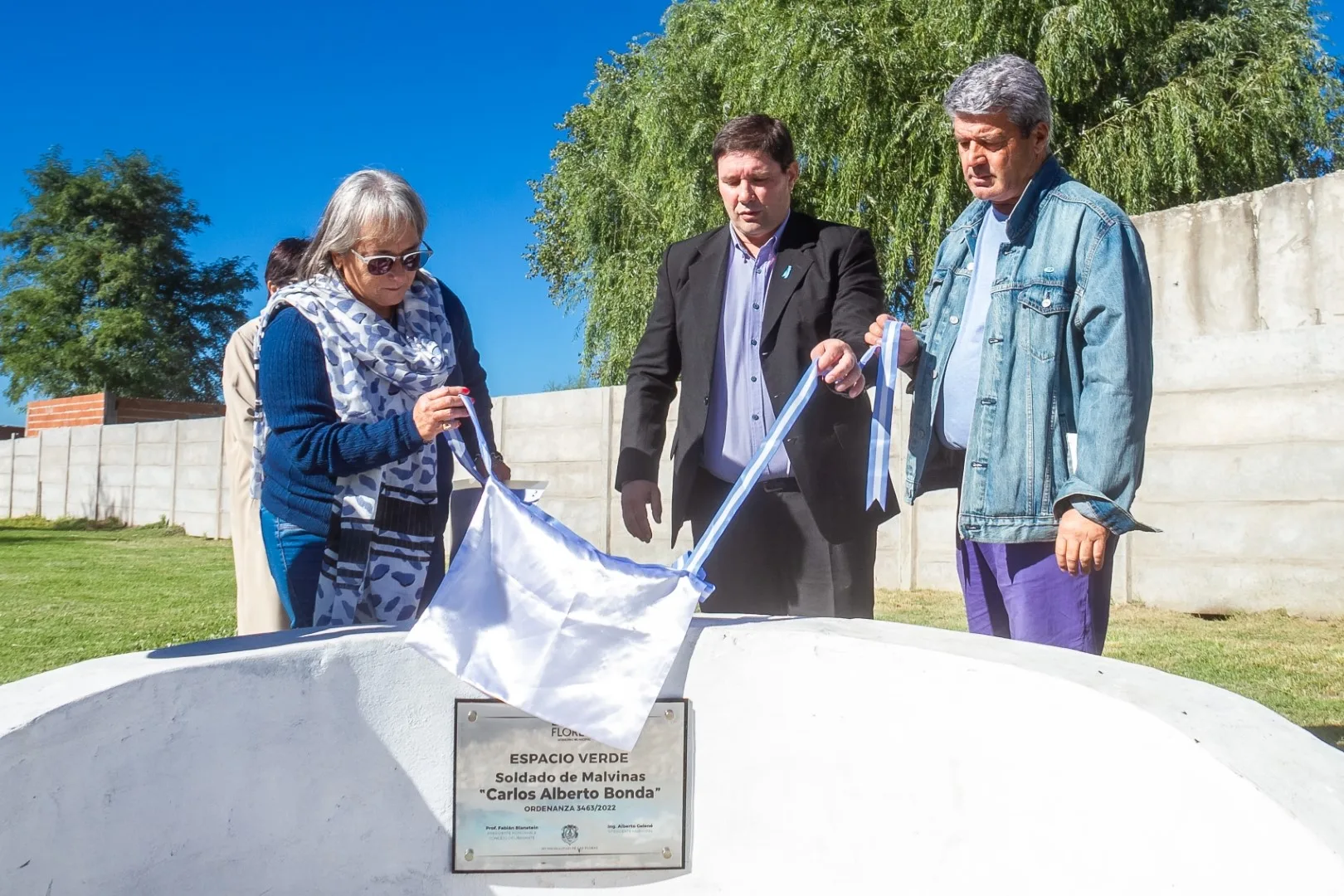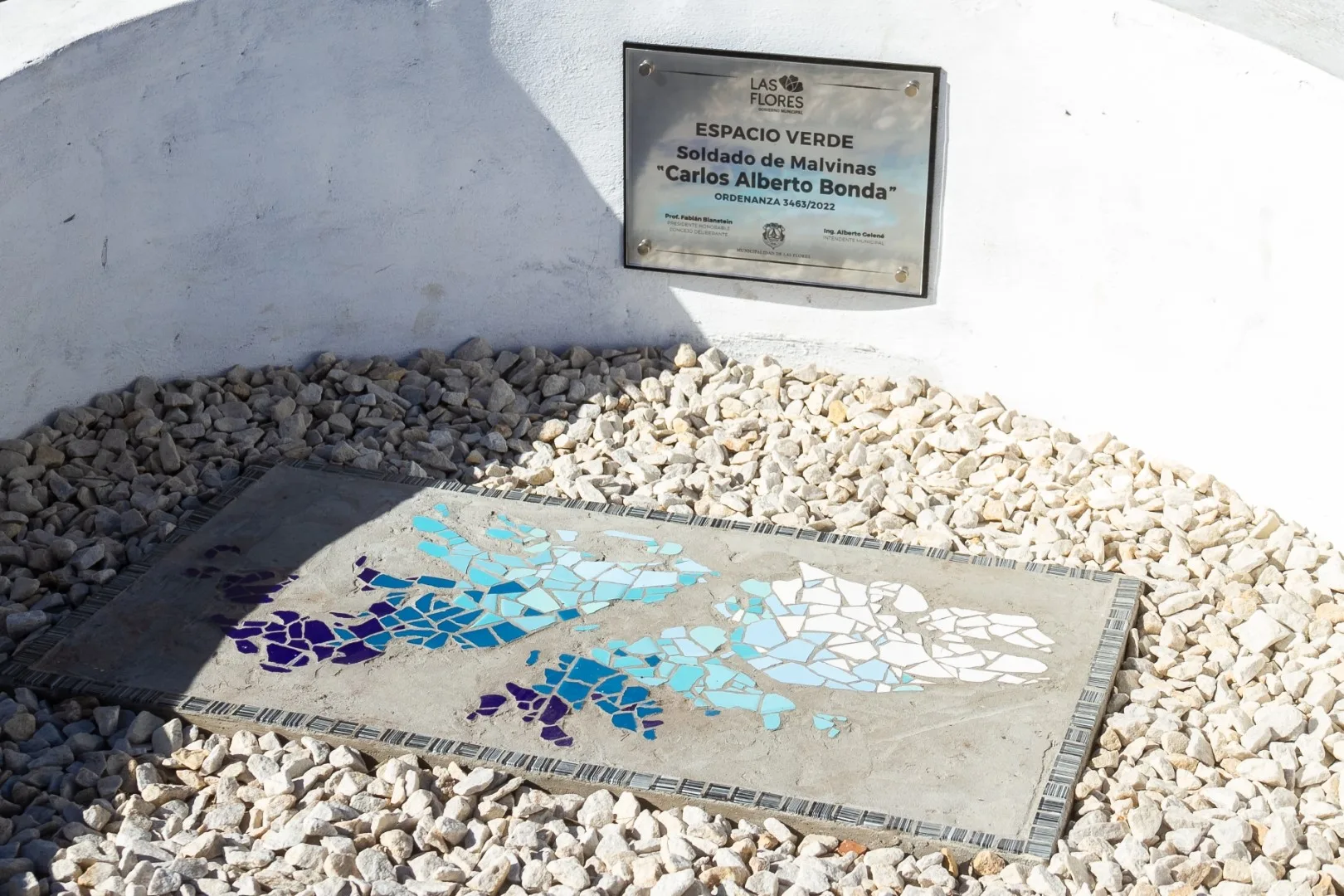 Allí, con la presencia de la esposa e hija del Veterano, el intendente interino Fabián Blanstein recordó a Bonda y en un emotivo momento se llevó a cabo el descubrimiento de la placa en el monumento que lleva la imagen de las islas realizada artesanalmente con la técnica de mosaiquismo.
