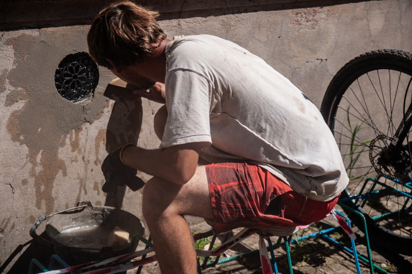 La colocación se llevó a cabo por las alumnas de los talleres de Albanilería y Moldería a cargo de Mauricio Cartasso y Muriel Couzelo, adquiriendo así el frente de la institución, su valor arquitectónico original.