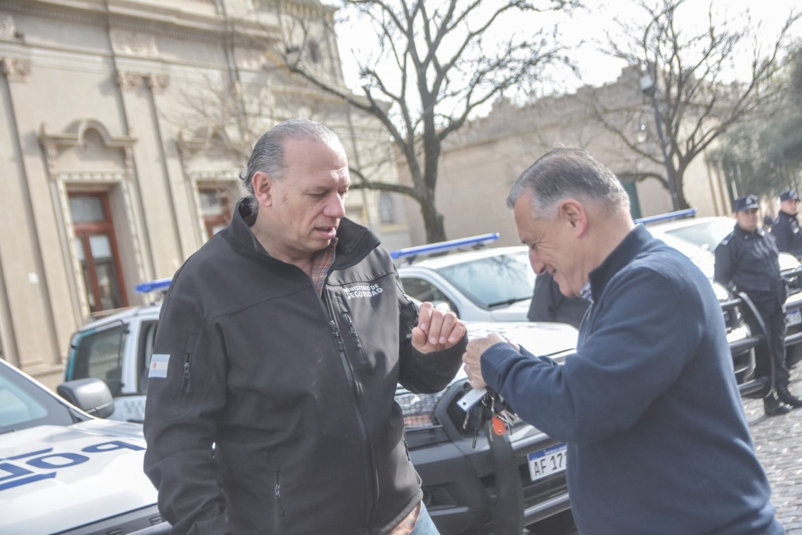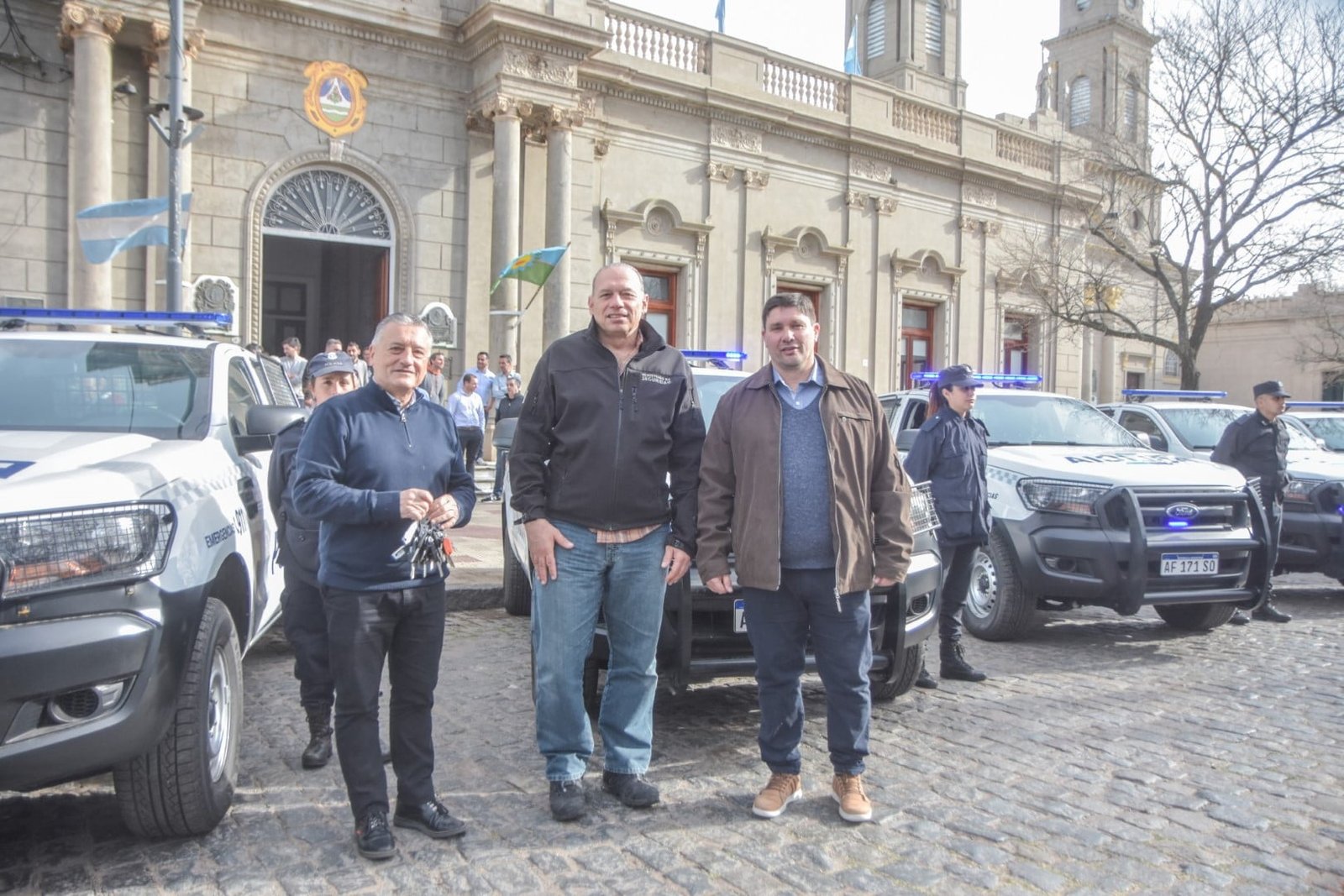Esto comprende la renovación total de la flota vehicular a partir de la entrega de móviles: los siete que se recibieron oportunamente en el distrito para el Comando de Patrulla Rural y ahora las 8 nuevas camionetas que fueron entregadas en marco de esta visita y que serán destinadas al ejercicio de la repartición Comunal.