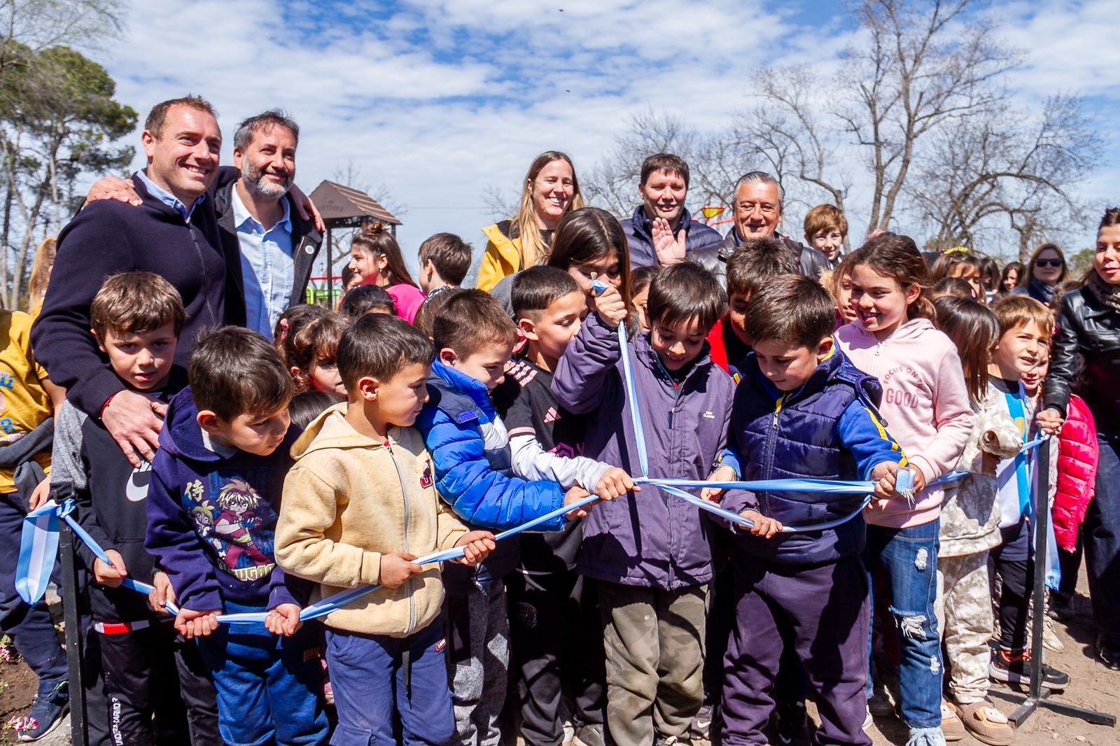 El intendente Gelené, acompañado por el presidente del Concejo Deliberante, Fabián Blanstein; la secretaria de Desarrollo Humano, Mariángeles Basile; el asesor en Políticas Publicas, Emil Gelené; Alejandro Alegretti y Juliana Petreigne, junto a los niños y niñas presentes, cortaron la cinta argentina y dejaron inaugurado formalmente el Parque de Juegos de Plaza Sol.