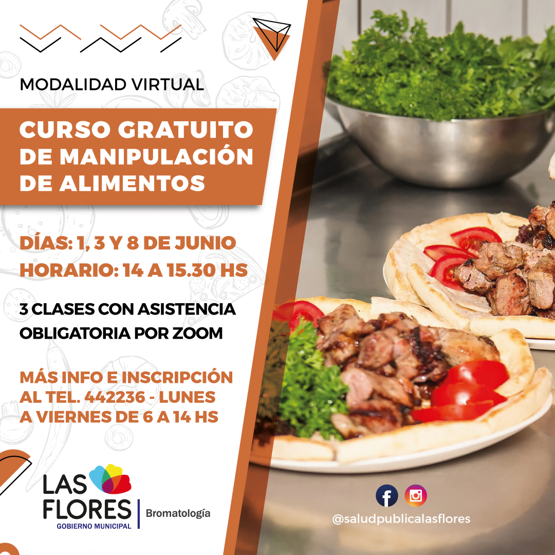 La Dirección de Bromatología informa a la población en general que se encuentra abierta la inscripción a un nuevo curso gratuito de manipulación de alimentos, que se realizará los días 1, 3 y 8 de junio de 14 a 15.30 hs. El curso tiene una duración de 3 días con asistencia obligatoria. Los requisitos necesarios para poder realizar el curso es contar con la aplicación ZOOM descargada en el celular o computadora y acceso a Internet.