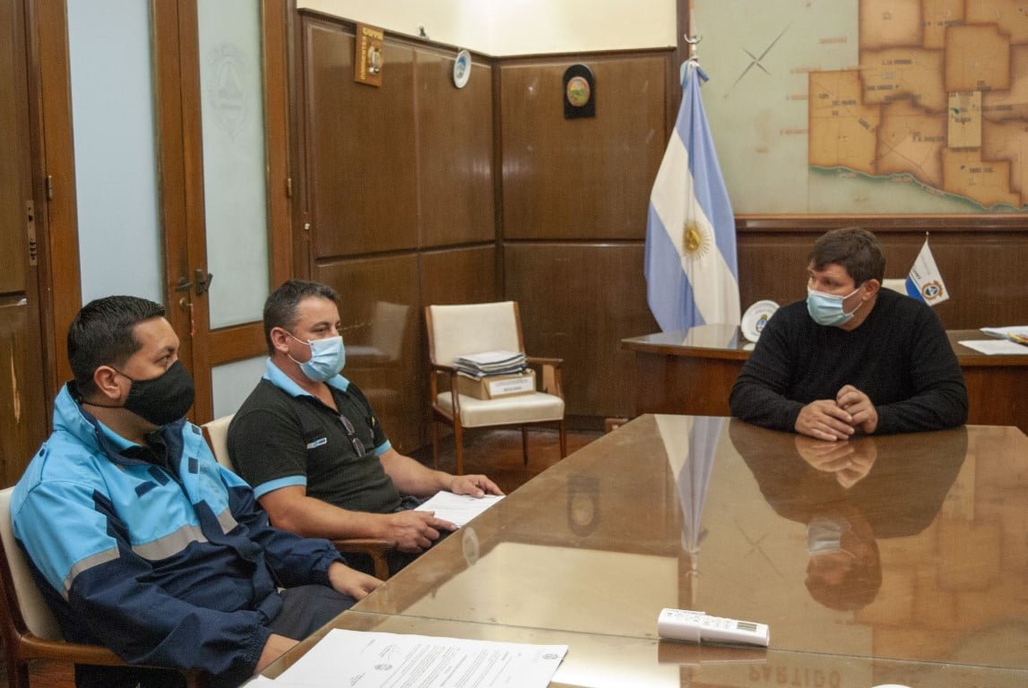 Esta mañana el intendente interino Fabián Blanstein, acompañado por el secretario de Gobierno, Javier Di Giano y el subsecretario de Protección Ciudadana, Hugo Gallardo, recibió en la sala de audiencias al comisario Cesar Acuña y al oficial inspector Julio Paniagua, representantes de la Subsecretaría de Coordinación y Logística de la Policía Bonaerense, quienes inspeccionan el estado del parque automotor de todas las dependencias policiales.