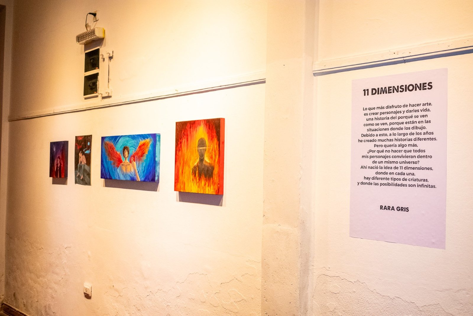 La alumna del profesor Axel Nygaard del Taller Más Arte de nuestra ciudad, presentó en sociedad su excelente trabajo titulado 11 Dimensiones. Las pinturas exhibidas se complementan con proyecciones audiovisuales que muestran la técnica de utilización para desembocar en los trabajos que Rara Gris viene realizando desde hace años.