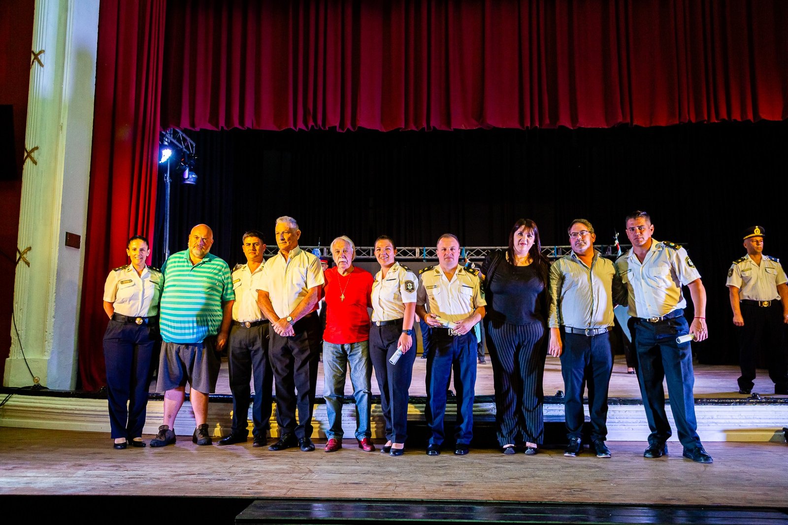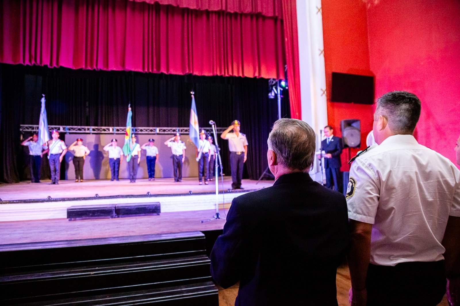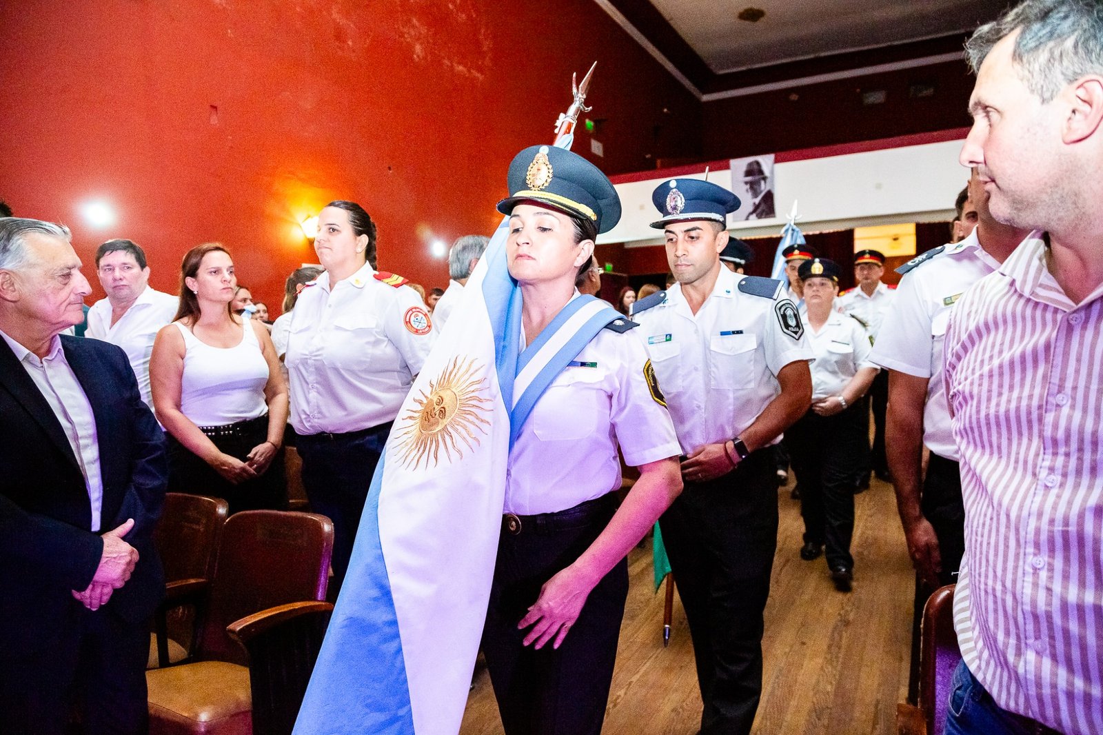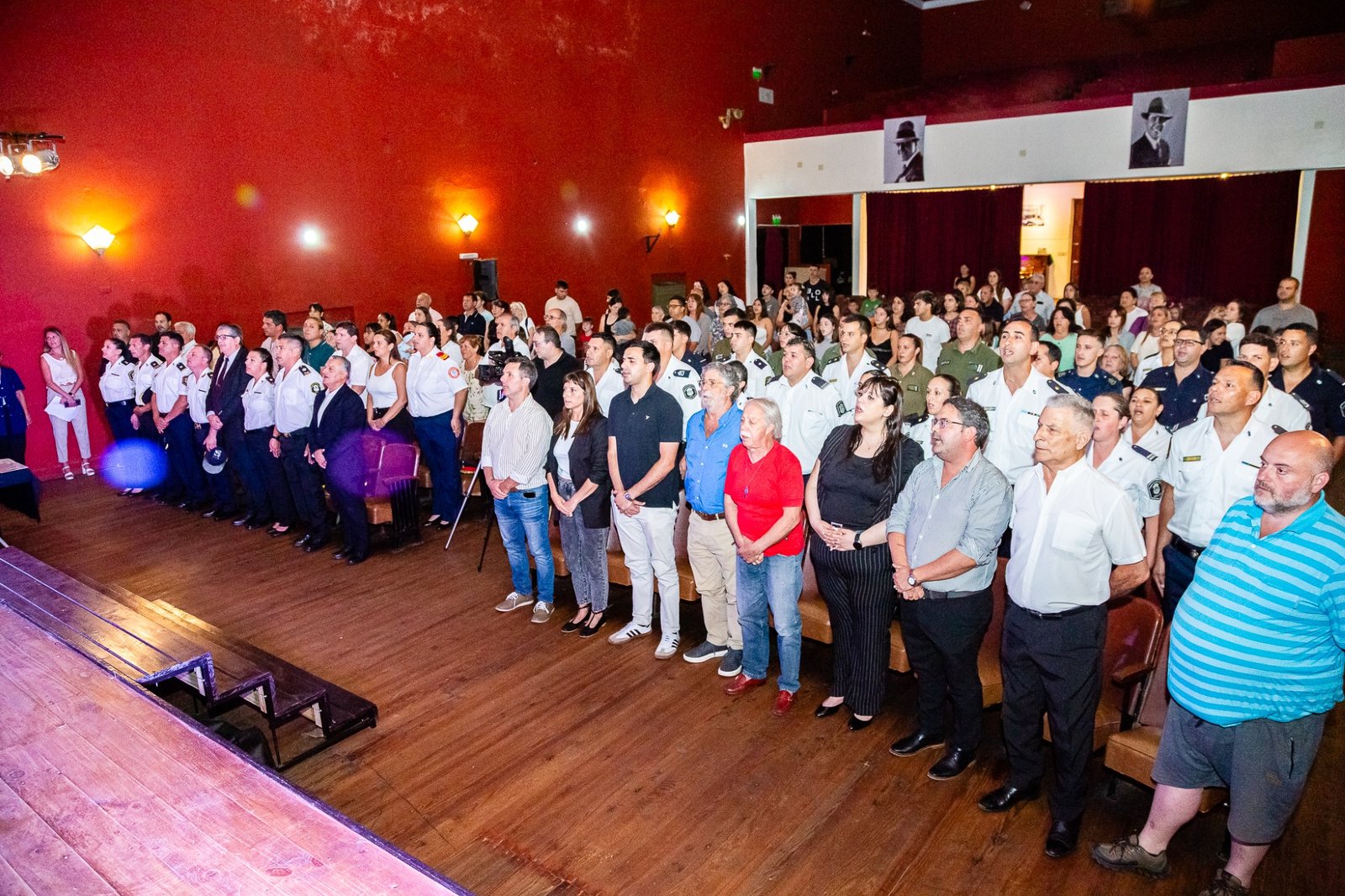 El Teatro Español reunió a autoridades, jefes de las diferentes dependencias y a efectivos. El inicio tuvo lugar cuando el intendente Alberto Gelené concedió la autorización para el comienzo del Acto tras la solicitud realizada por el Jefe de Línea.