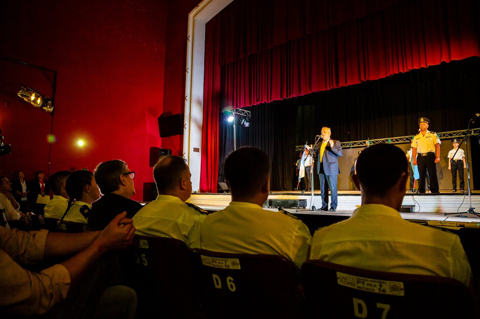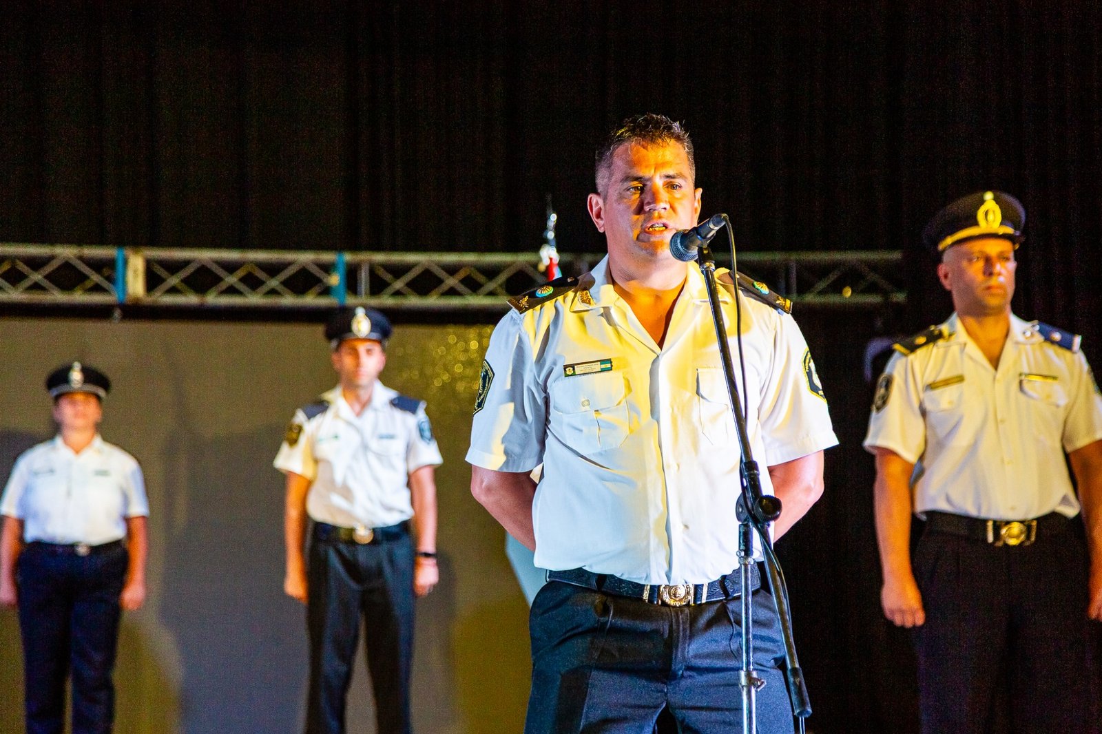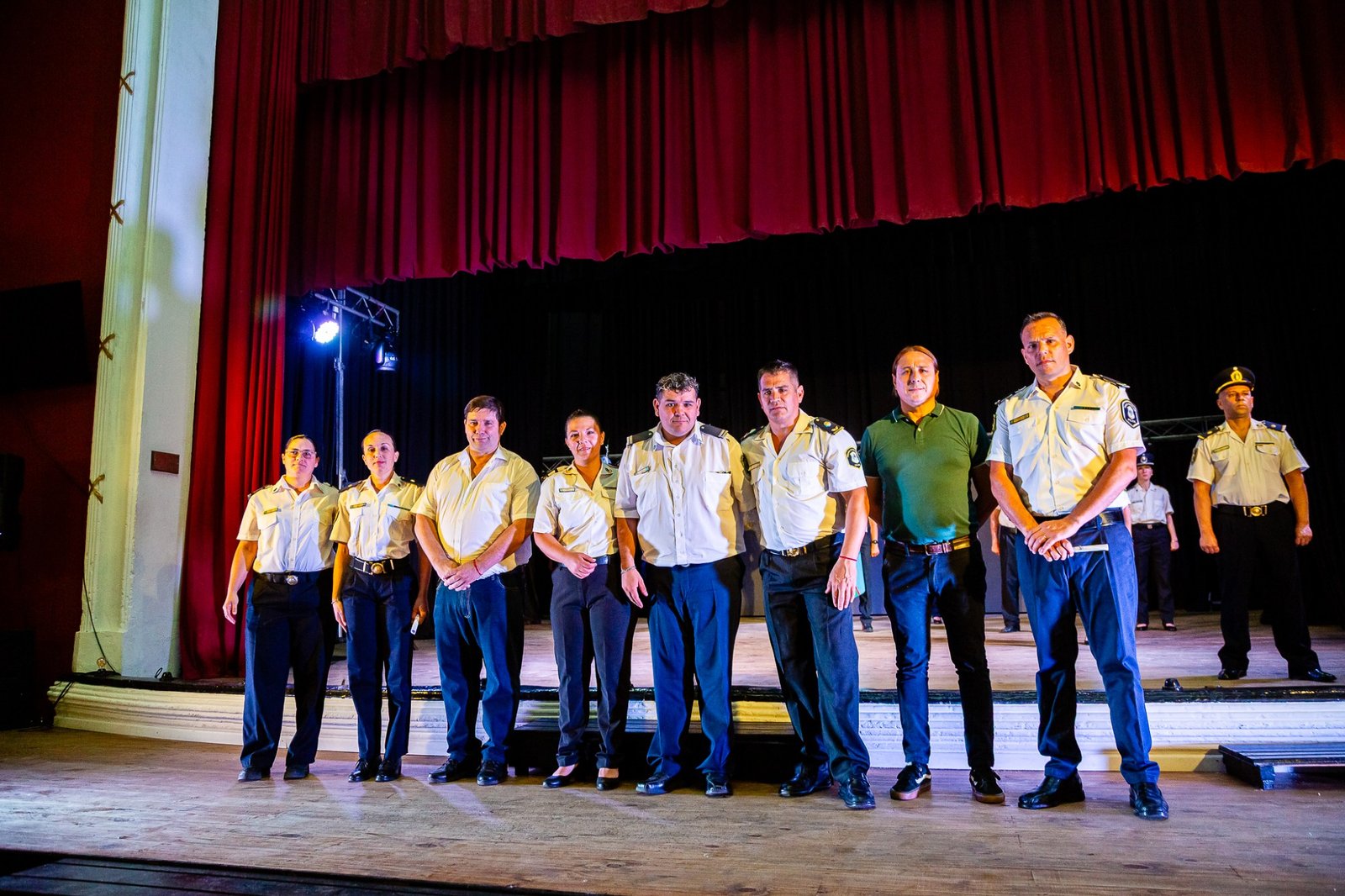 El Teatro Español reunió a autoridades, jefes de las diferentes dependencias y a efectivos. El inicio tuvo lugar cuando el intendente Alberto Gelené concedió la autorización para el comienzo del Acto tras la solicitud realizada por el Jefe de Línea.