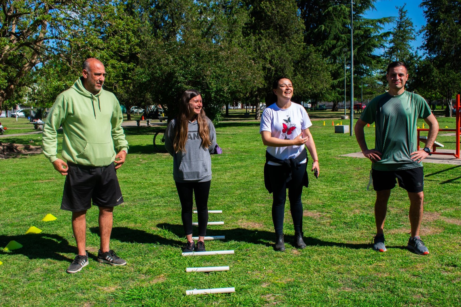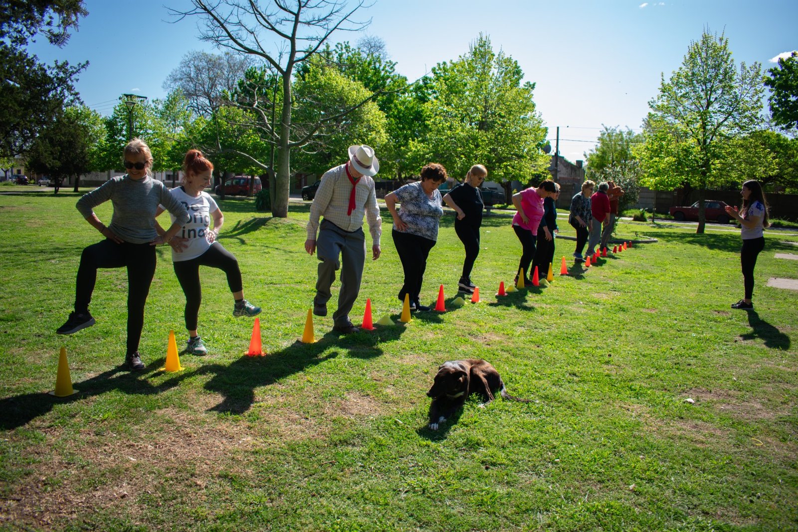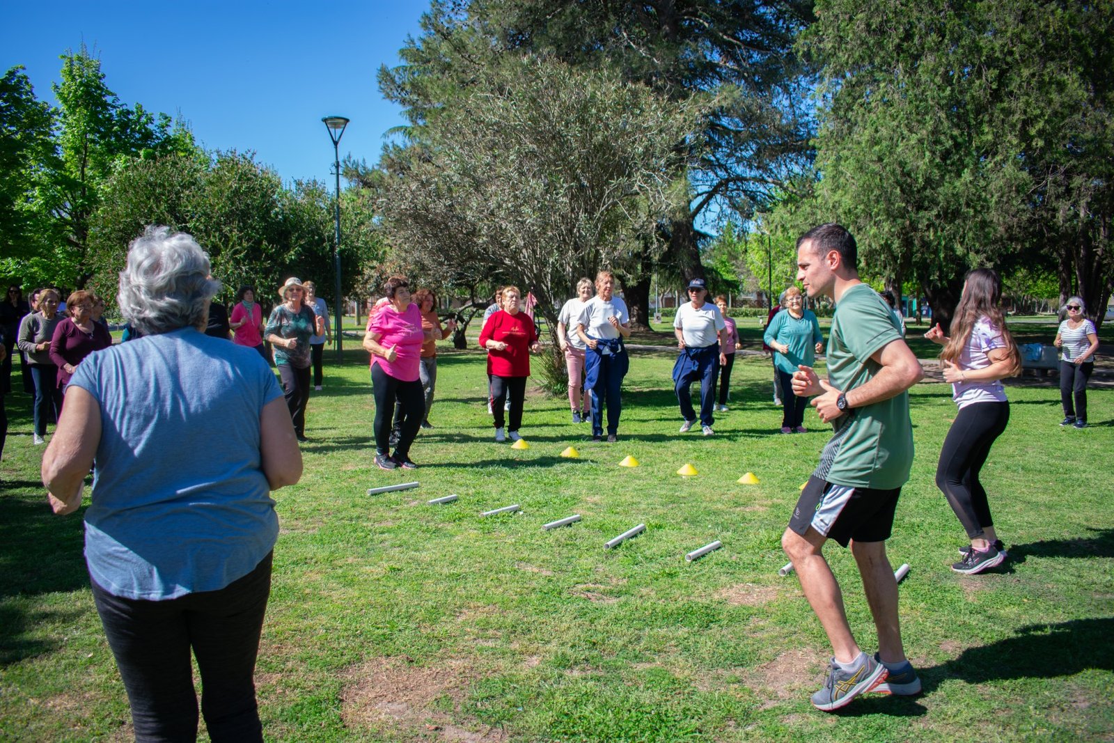 Los profes Antonella y Enzo guiaron una entretenida clase de actividad física, enfocada en la movilidad, la coordinación y el bienestar general, a través de ejercicios adaptados a las necesidades de los presentes.
