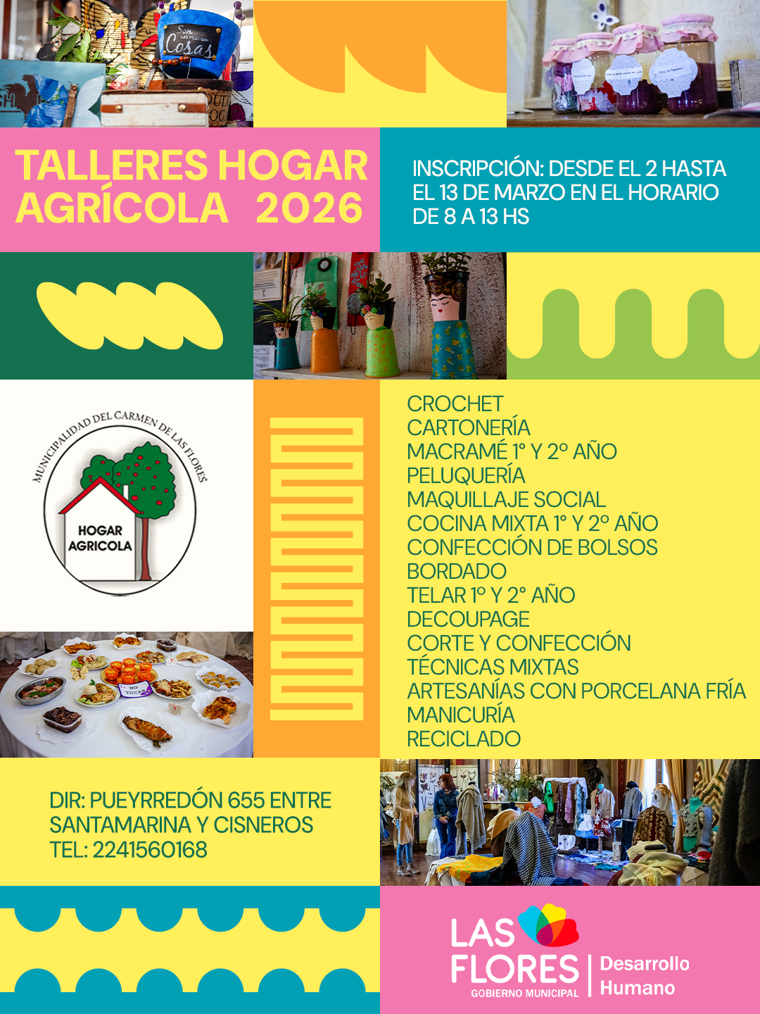 El Hogar Agrícola, dependiente de la Secretaría de Desarrollo Humano, informa que a partir del 2 y hasta el 13 de marzo se realizará la inscripción a los Talleres que se dictarán durante el año: