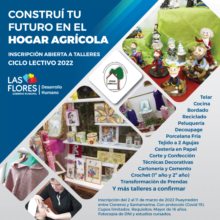 Se podrá inscribirse en el Hogar Agrícola a partir del miércoles 2 y hasta el viernes 11 de marzo, de lunes a viernes en Pueyrredón entre Cisneros y Santamarina. Con protocolo Covid- 19. Cupos limitados. Requisitos: Mayor de 16 años. Llevar fotocopia de DNI y estudios cursados.