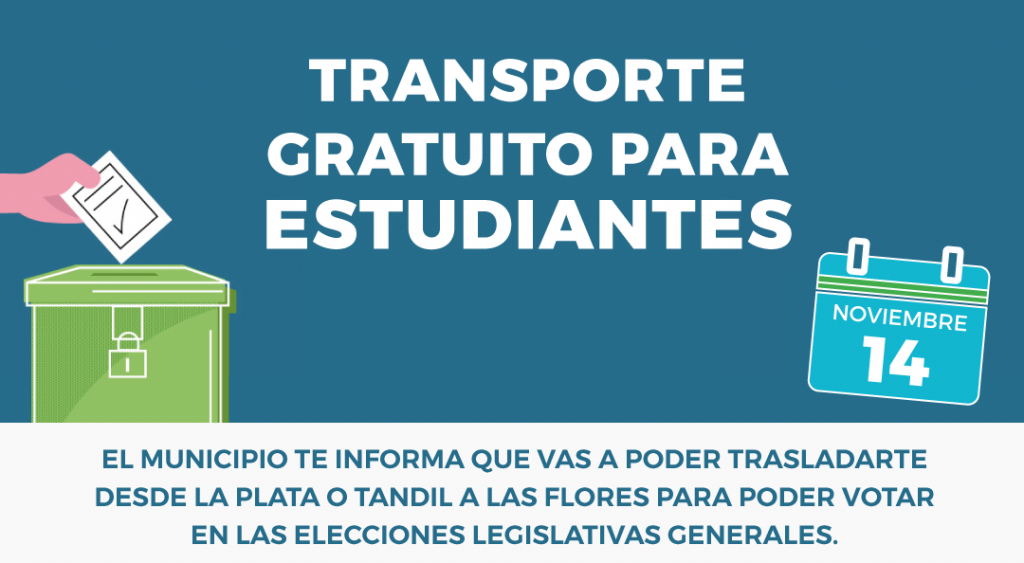 La Secretaría de Educación comunica a estudiantes universitarios que residen en las ciudades de La Plata y Tandil, que el municipio dispondrá de transporte gratuito para trasladarse a Las Flores, con motivo de desarrollarse el domingo 14 de noviembre, las Elecciones Legislativas generales.